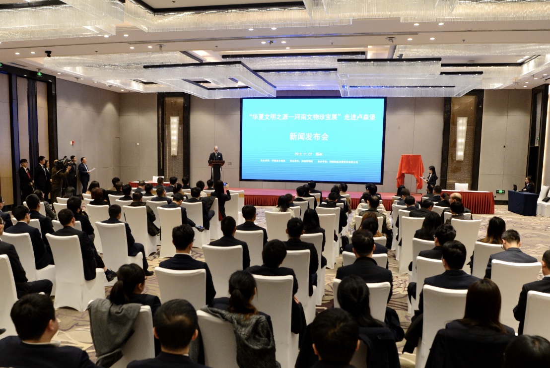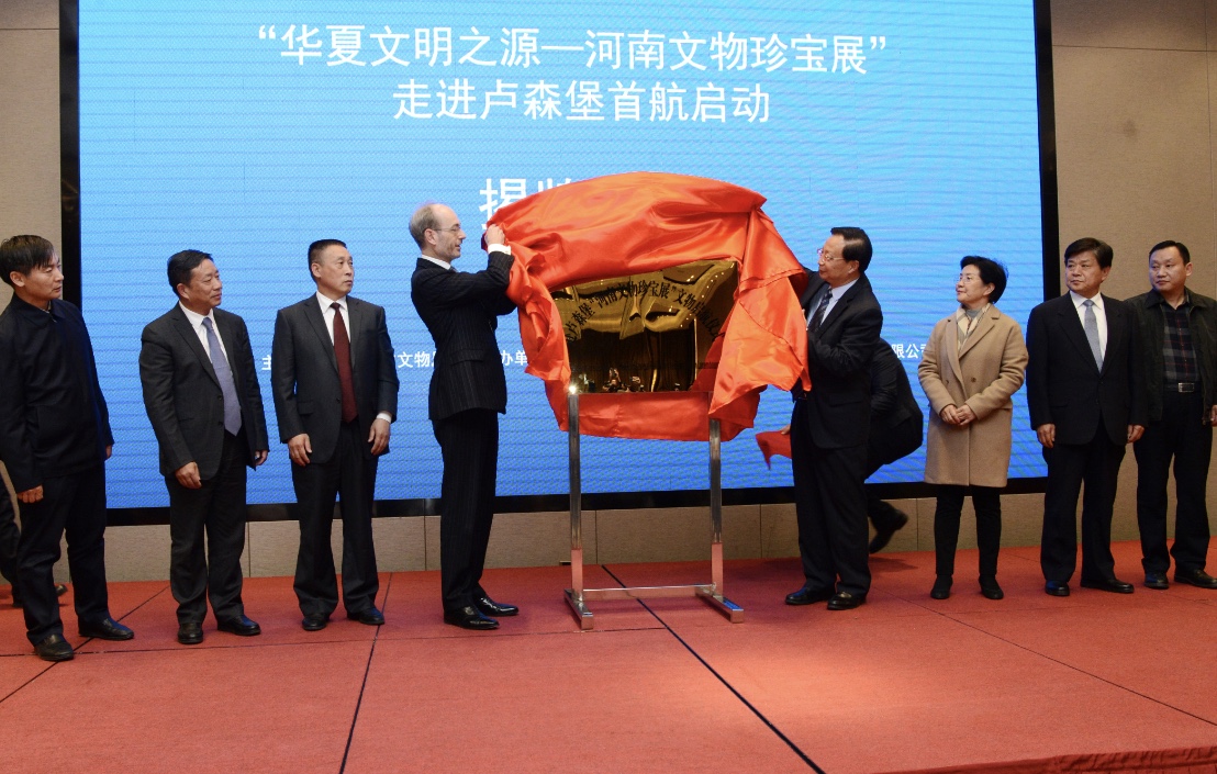 河南省政協副主席高體健,盧森堡駐華大使俞博生,河南省文物局局長田凱及河南航投總經理、黨委副書記、副董事長劉建葆,副總經理郭艷紅等出席儀式。高體健、俞博生、劉建葆分別致辭。高體健和俞博生共同為啟動儀式揭牌。