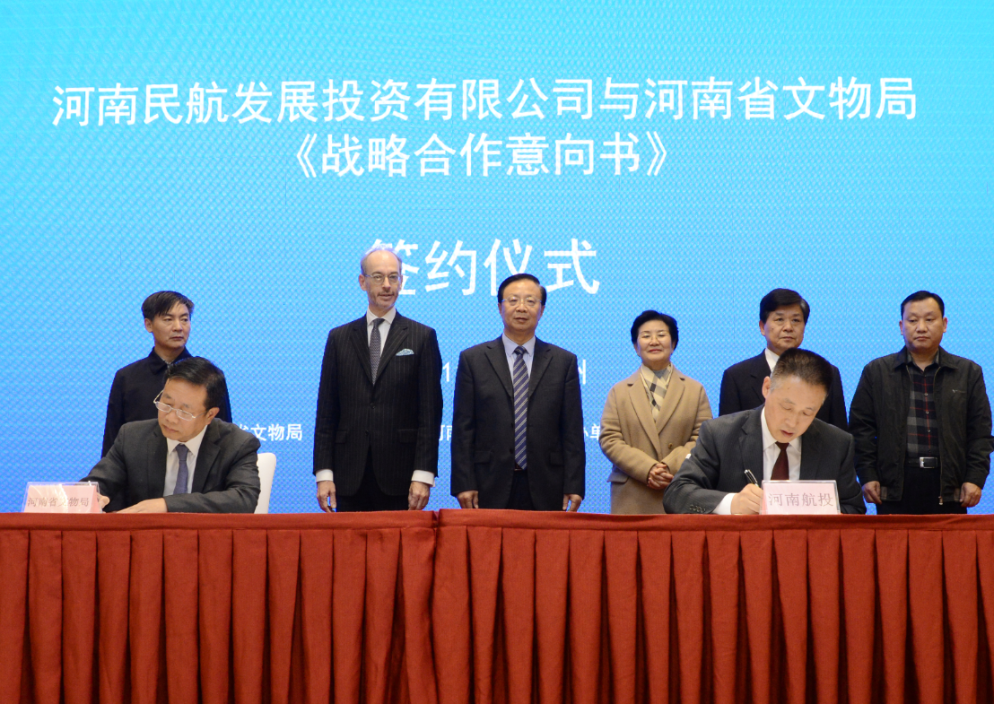 為進一步擴大雙方合作范圍,儀式最后雙方進行了簽約。劉建葆與田凱分別代表河南航投與河南省文物局簽署合作意向書,約定雙方將充分發揮各自優勢,積極落實省政府《鄭州-盧森堡“空中絲綢之路”建設專項規劃(2017-2025)》,提升豫歐文化交流水平,促進兩地民心相通。