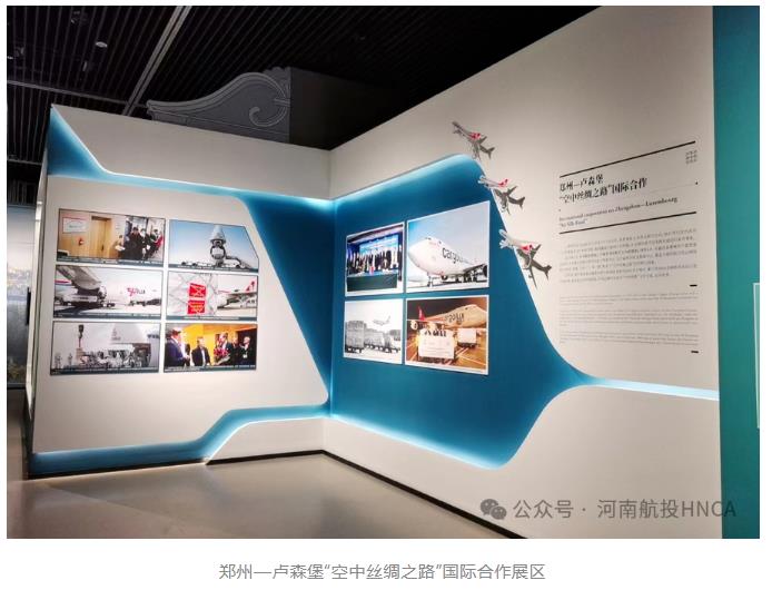這一主題展板上,精選了10張圖片記錄豫盧共建“空中絲路”的關鍵事件。既有2014年河南航投與盧森堡貨航在鄭州簽署股權合作協議、“鄭州號”巨無霸貨機首次抵鄭的起始節點;也有這條絲路承運河南省向盧方捐贈的抗疫物資、鄭盧直飛客航首批旅客抵達的溫暖瞬間;還有盧森堡貨航在鄭州加注可持續航空燃料、鄭盧航線貨運量突破100萬噸的喜慶時刻,精彩講述豫盧雙方在“一帶一路”框架下相融互促,從硬聯通、軟聯通到心聯通的生動實踐。